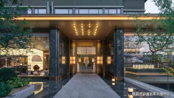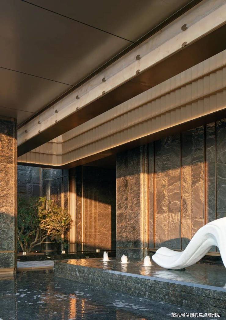 主入口空间向内退让,形成有温度的城市边界。52m超长门头水平横向舒展,既遵循中轴对称的传统礼仪范式,又以简约线条、奢华材质与极致工艺呈现艺术、轻盈的雅奢格调。前场庭院以“洄游”为理念,重构“四水归堂”的空间序列。