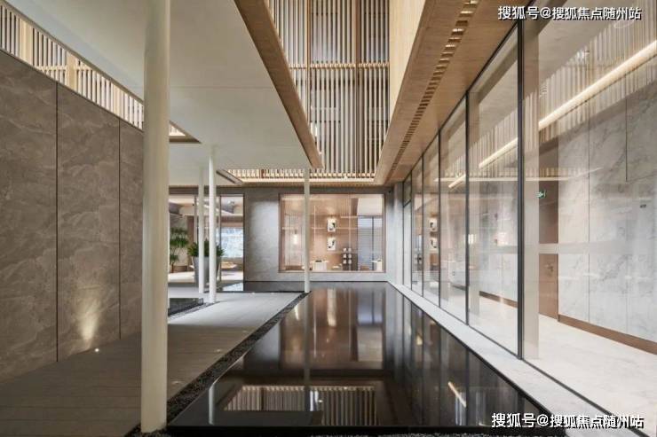步入超配公区,映入眼帘的是意大利设计大师匠心锻造的艺术展陈,木纹铝板巧妙拼接成“层叠波浪”,风起浪涌,目及之处流露闲然之美;吊顶、地面臻选成本昂贵却质地温润的仿木色铝板、岩板,呼应内堂、中庭的昂然绿意,回响自然主义的时代趋势。