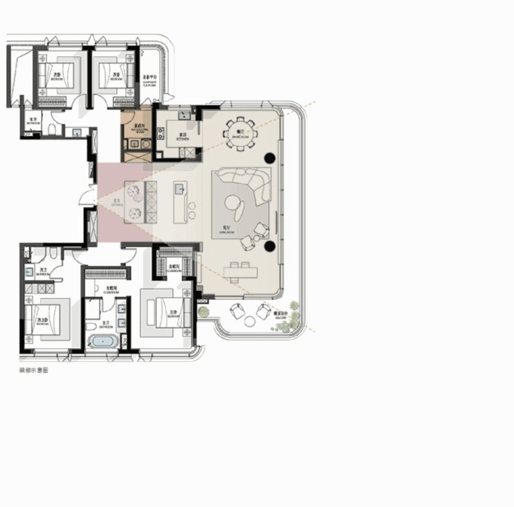 从家庭共聚回归内心独处,建筑面积约252㎡在四房规划的基础上,以“家庭平权”为设计内核。尤其是建筑面积约42㎡的主卧大套房,尊配双衣帽间、瞰景浴缸等。同时基于生活场景的跃级考量,满足大家族秩序性与私密性。