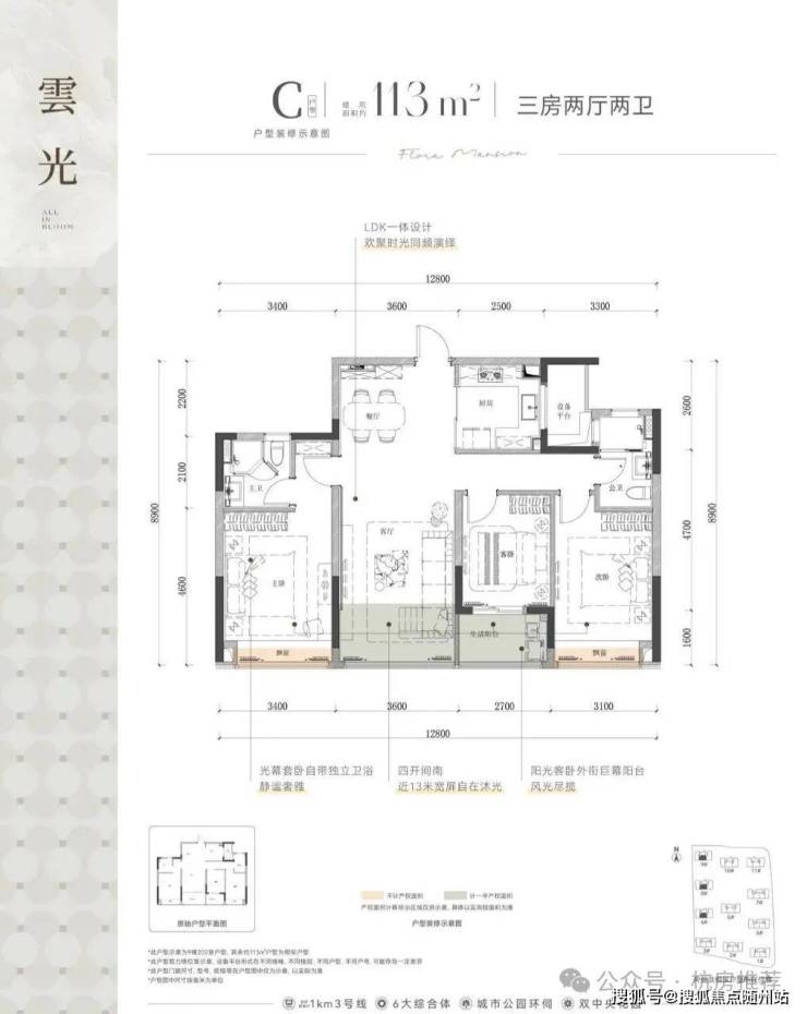 其次是建面约113㎡的三房两厅两卫户型,四开间朝南,拥有封闭式阳台,南向采光充足,使得整体空间更加宽敞明亮。