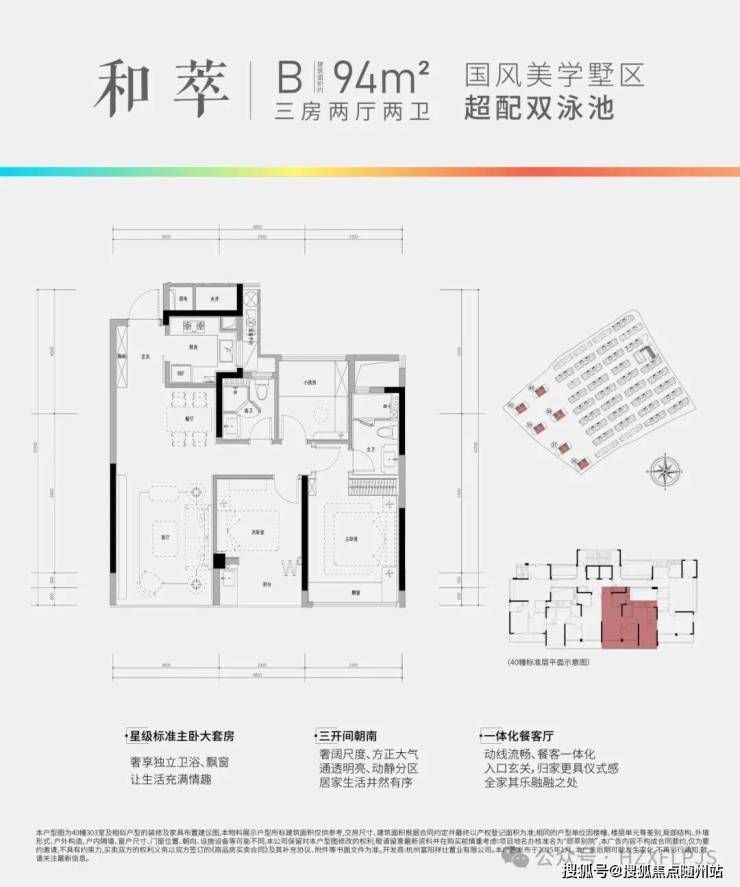 山水·颐萃别院容积率1.5,分为高层和排屋两个区,高层区总共6幢住宅,只规划了三款户型:建面约95方、约97方和约111方。