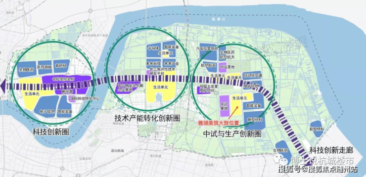 杭州城市规划以“钱塘江走向”为城市发展布局,深度贯彻“拥江发展”;以“滨江国家高新区”、“奥体亚运板块”、“空港示范区”形成拥江南岸发展;以“武林中心”、“钱江新城”、“杭州经济开发区”形成拥江北岸发展;最终拥江南北岸的发展在钱塘区交汇后落址临江国家高新区;本案所处的临江是杭州第2个国家级高新区,与滨江国家高新区同级,形成省委、省政府“四大建设”部署“西有滨江·东有临江”的发展布局。2021年,半年实现地区生产总值超540亿元,实属杭州实体经济大战的主战场。