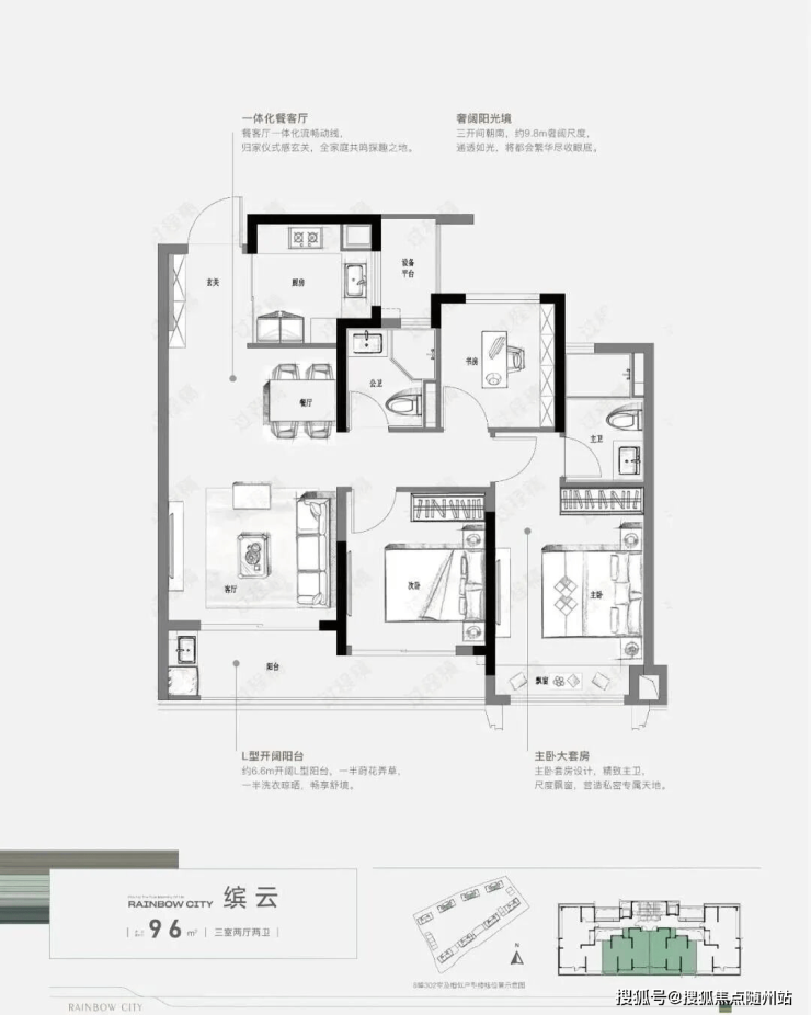 约96㎡户型:三开间朝南,配备约6.6米L型阳台,采光通风良好 。