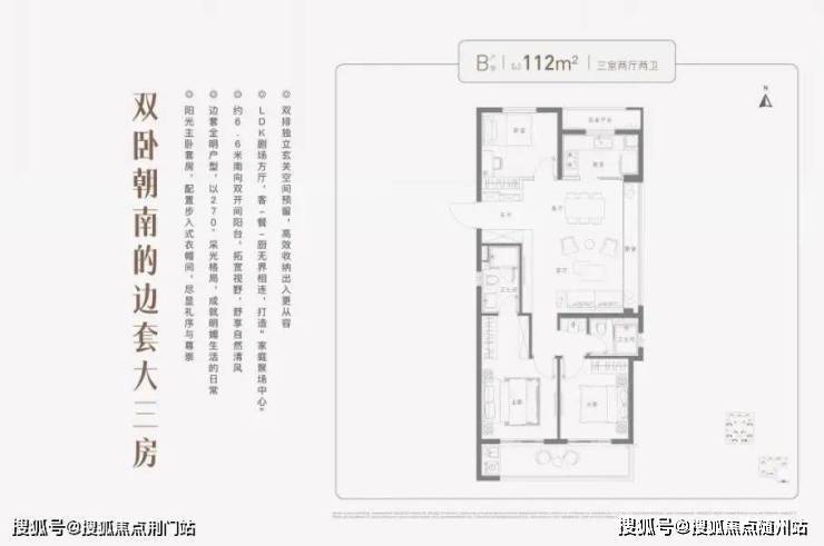 建筑面积约112㎡,是一个双卧朝南的边套大三房户型。玄关的打造,增添了归家的仪式感。而客餐厅的一体大飘窗,则是成为了家庭多功能休闲区。此外,主卧衣帽间、卫浴间、景观阳台一应俱全, 直接将生活的幸福感拉满。