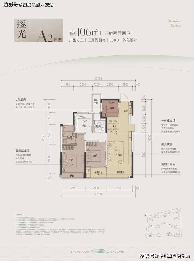 建面约106方A户型,三房两厅两卫:
