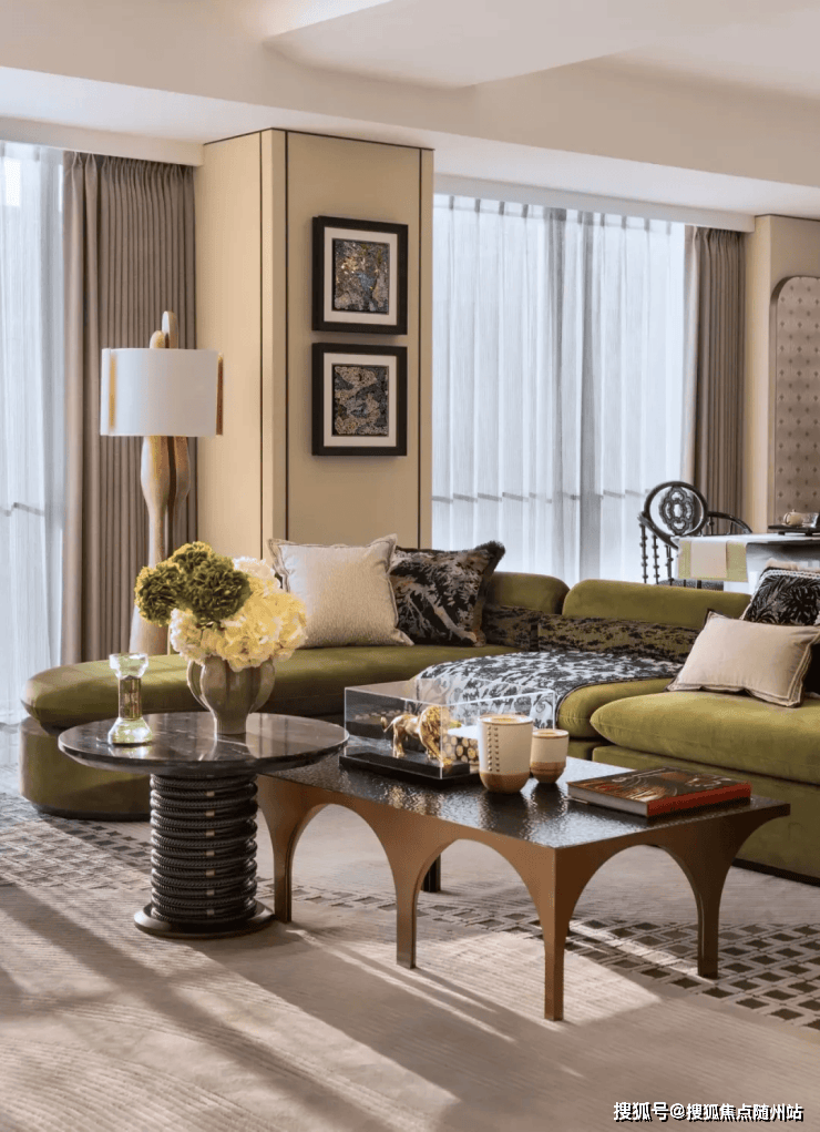 草绿色的沙发勾勒出大草原的意境,品牌茶几和玄关的桌子呼应。优雅的地毯勾勒出会客厅的核心区域,不同的座椅增加对话场景。海派的融合力量下,丰富的艺术元素巧妙衔接,丰富的细节彰显奢华。多元化的设计主题下,增加社交和品鉴的场景。