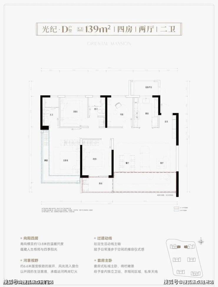 鸣澜里139平户型同样做的不错,打造四房两厅两卫,分为横竖两款,全部为边套,两梯两户设计。其中,139平竖厅户型亮点分析:① 户型得房率超高,达到约93%;② 南向3个卧室,采光优且满足二胎家庭和三代同堂居住需求;③ 客厅面积达到约37平,足够大,同时额外配置约2.6平的储物间。