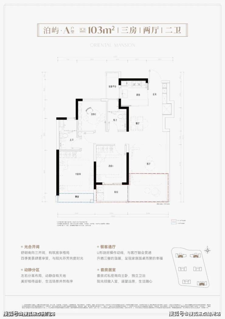 建面约103平,三房两厅两卫。三大亮点分析:① 南向三开间,朝南次卧带阳台,客厅联通阳台后,空间阔绰;② U型厨房且半开放设计,玄关含S墙冰箱位,利用率高、采光更优;③ 新规户型得房率高达约90%以上。