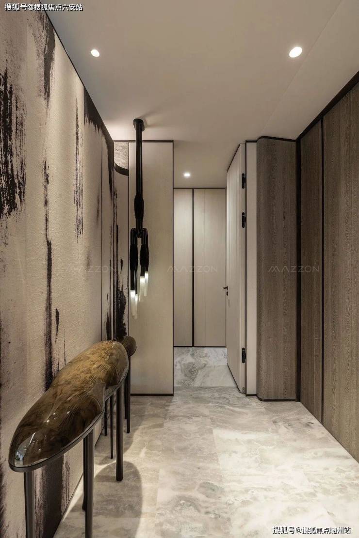 推开门扉,步入玄关,映入眼帘的是水墨般背景墙。一侧的玄关柜以天然木纹为基底,温润肌理似岁月沉淀的痕迹,柜内暗藏灯带设计,柔光如水,照亮归家的仪式感。